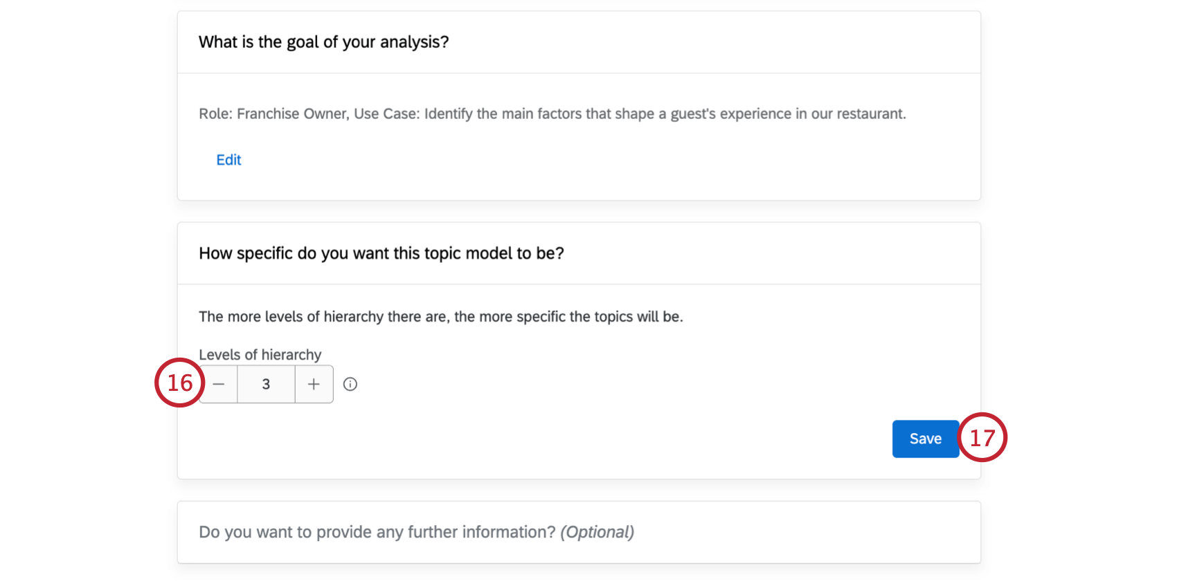 - Enter the role in the company of the user persona who will use the topic analysis output (e.g., Employee Experience Manager, In-store Manager).