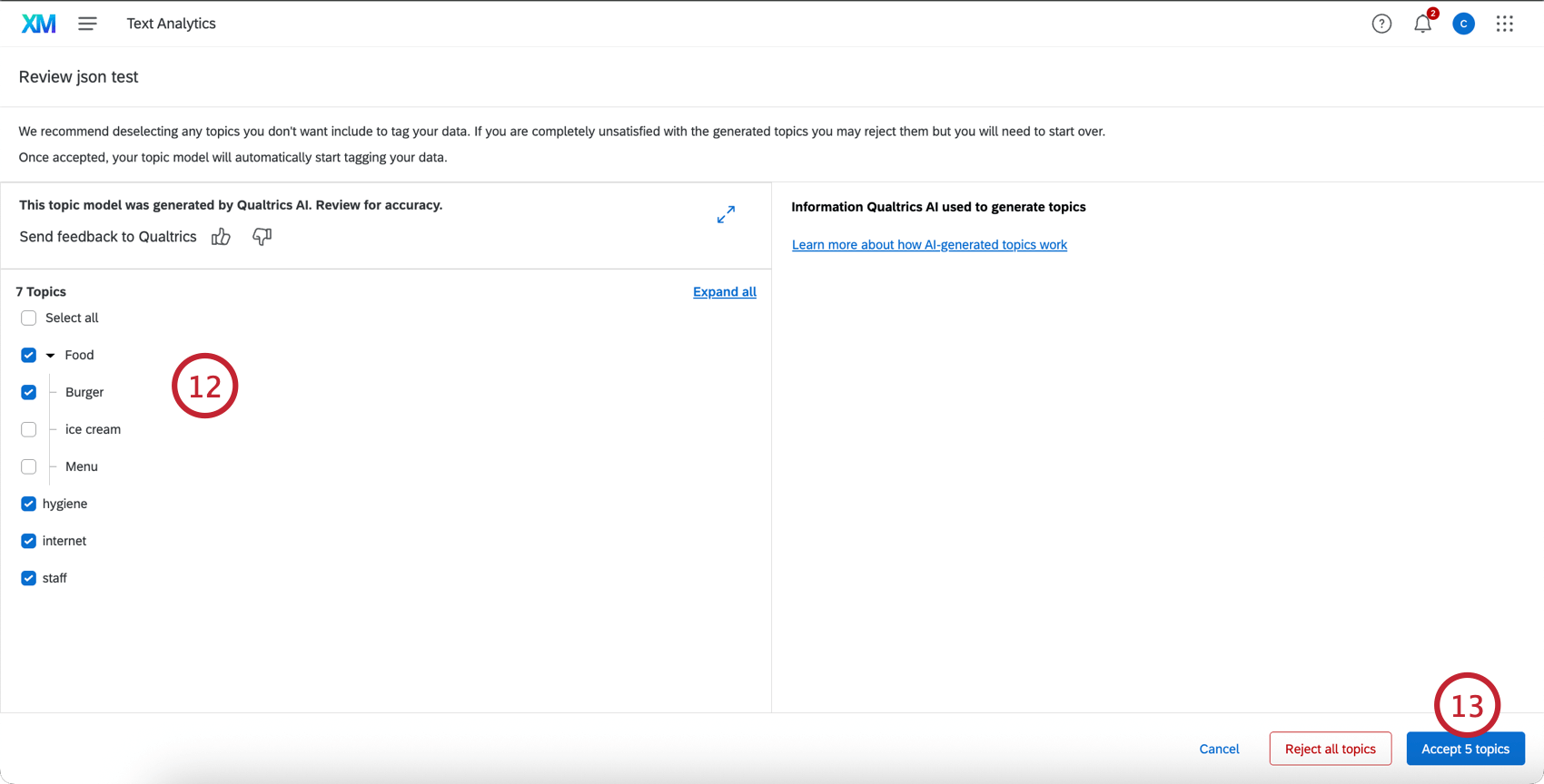 - Delete the Text iQ topic model. Please note that manual tags will not be carried over to AI-powered topics.