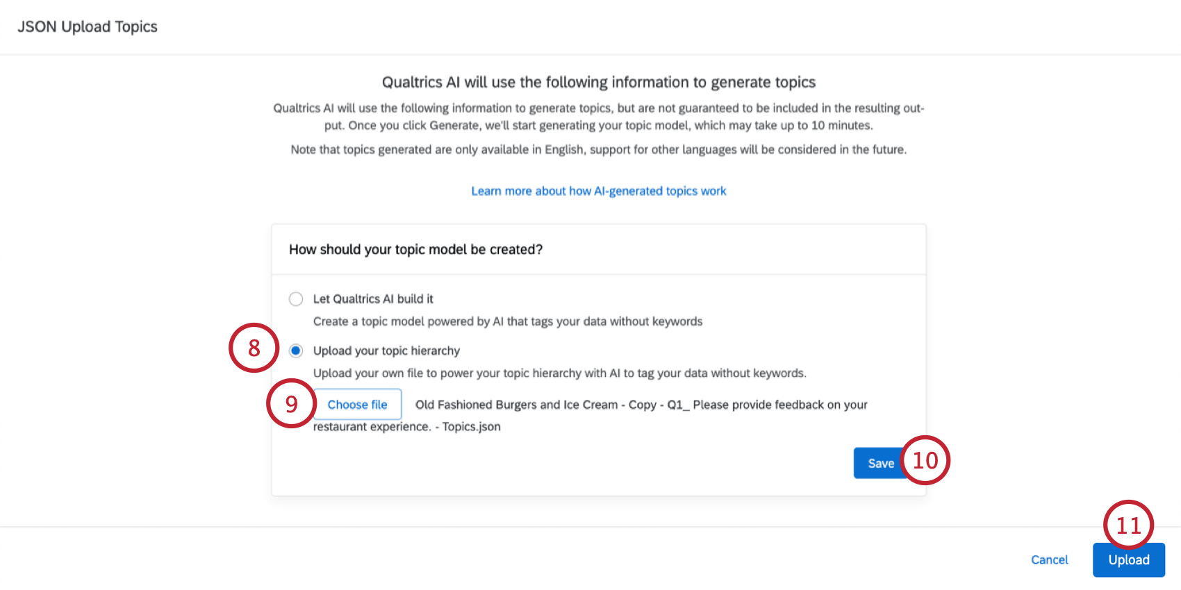Qtip: The “Upload your topic hierarchy” option is useful if you have an existing topic hierarchy in JSON format that you’d like to reuse instead of generating a new hierarchy. - Click Save.