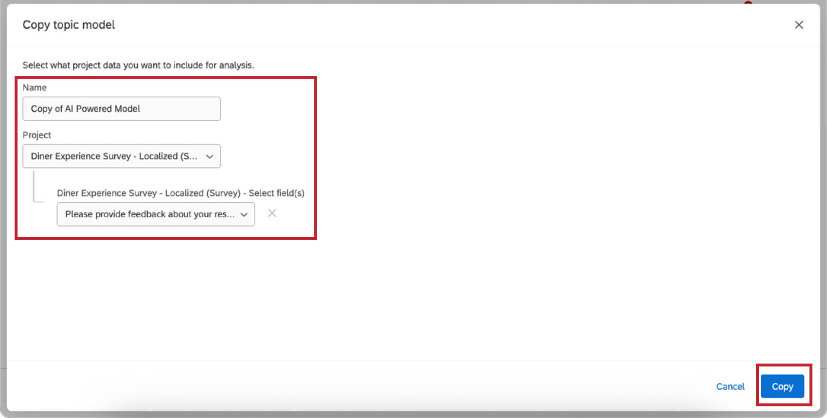- Copy: Copy the topic model structure to another data source. You’ll give your copy a name, and select the project(s) you’d like to use as the data source.
