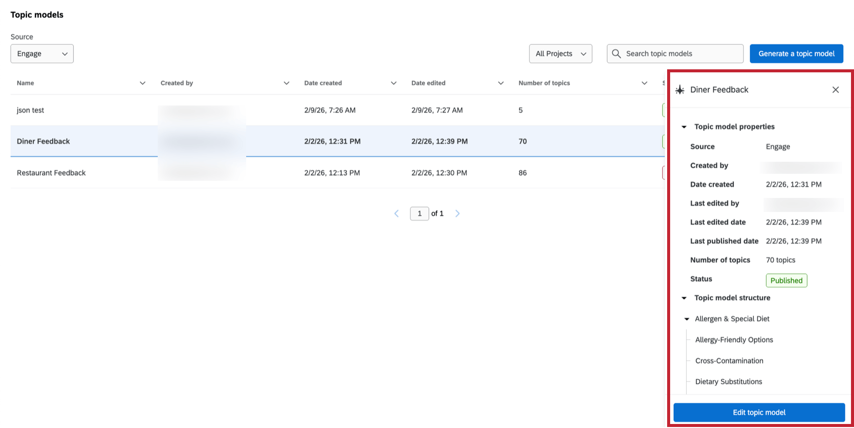 - Details: View details about the model, including the Source, Created by, Date created, Last edited by, Last edited date, Last published date, Number of topics, and Status. You can also drill down into the different levels of the model here, or click Edit topic model to make edits to your model.