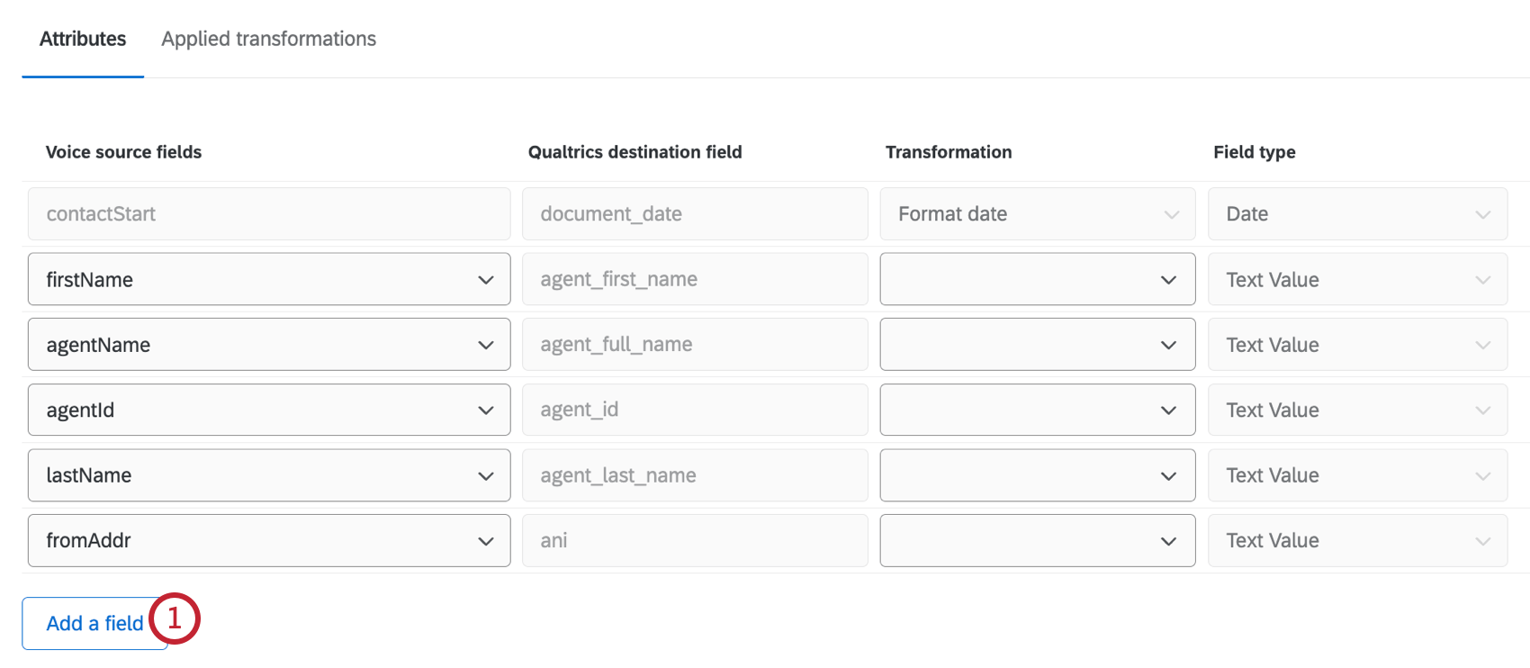 In the data mapping stage, you’ll map your voice provider attributes to the corresponding fields in your Voice project. You can also specify the field type for each field and apply transformations. The data mapping section has 2 tabs:
