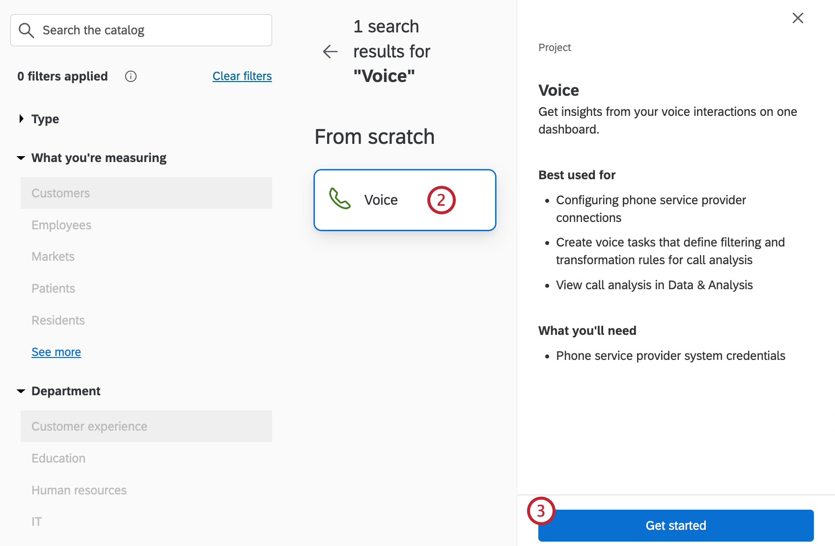 You can create a Voice project by going to the Catalog and searching for the project type by name.