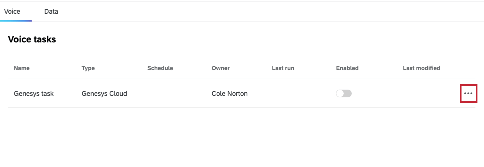 Once you’ve created a voice task in your project, you can view it within the Voice tab. Click the toggle in the Enabled column to enable or disable a task. Click the 3 horizontal dots to the right of a task to perform the following actions: