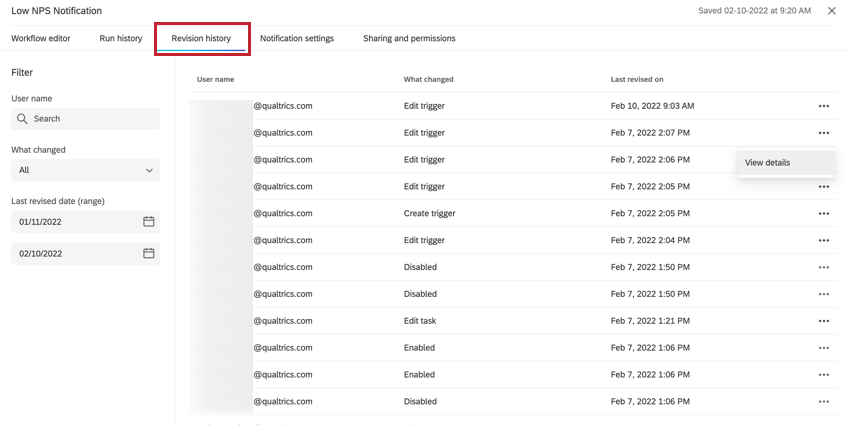 While editing a workflow, you can go to the Revision history tab to see a log of every change that has been made to your workflow.