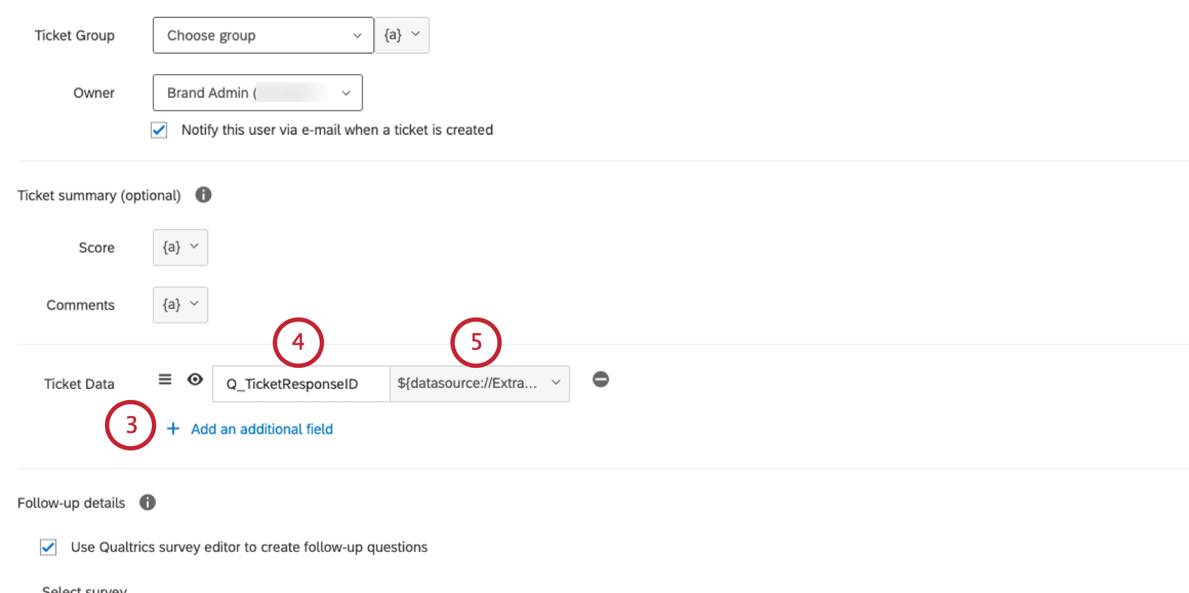 When you are setting up a tickets task, you are allowed to add additional information to the ticket called ticket data. These fields can be customized however you like, pulling in survey responses, embedded data values, and much more.