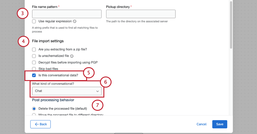 - Set whether your data is conversational or not, and then set it to chat or email. To learn more, see Extracting Conversational Data from an SFTP.