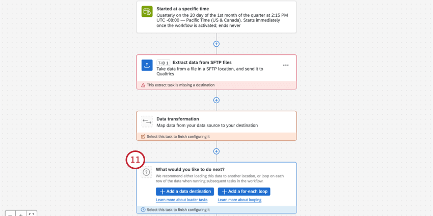 The Extract data from SFTP files task allows you to import data from your SFTP server to use in Qualtrics. You can use this task to process just one or multiple files at a time. You can combine this task with other tasks, such as the Load data to XM Directory task, to import data into other places in Qualtrics.