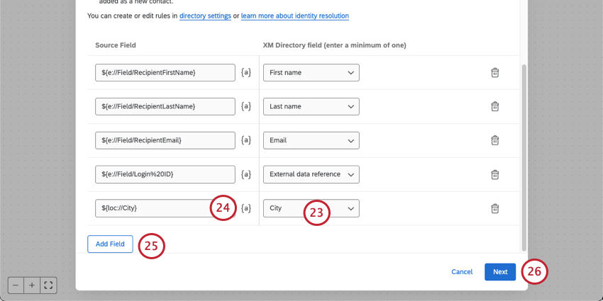 - On the right, select one of the fields you want to move from survey 1 to survey 2. In this example, we want to save the respondent’s City.
