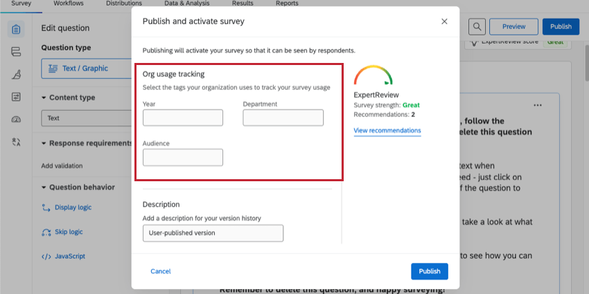 Sometimes, as a survey editor, you may be required to add tags to surveys. These will be labeled “Org usage tracking.” If your Brand Administrator has enabled Require all tags, you must tag your survey before it can be published for the first time.
