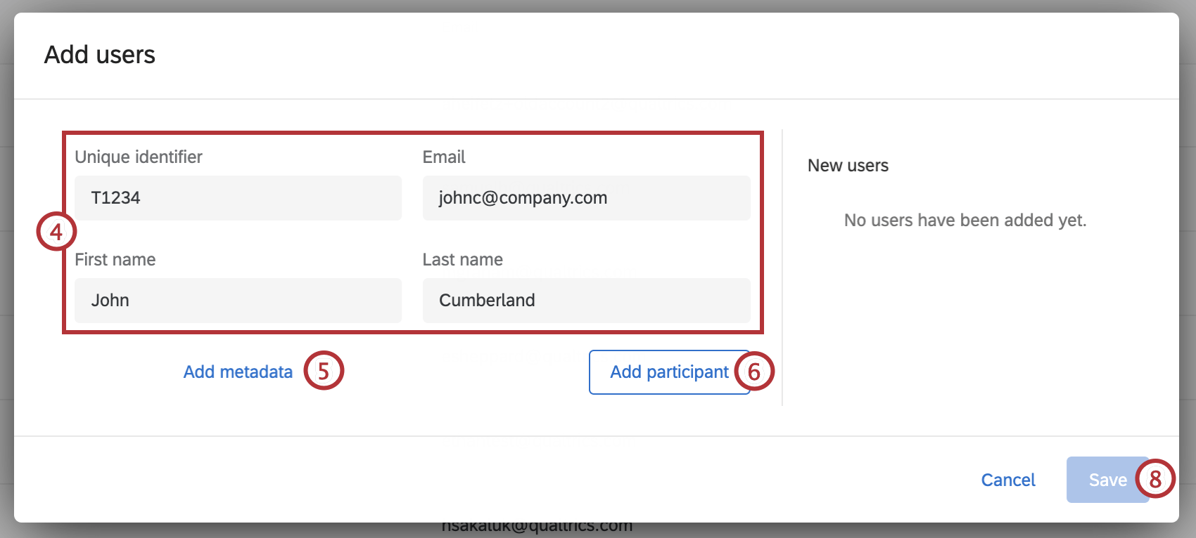 - Fill out the fields. You must at least provide an email, first name, last name, and unique identifier.