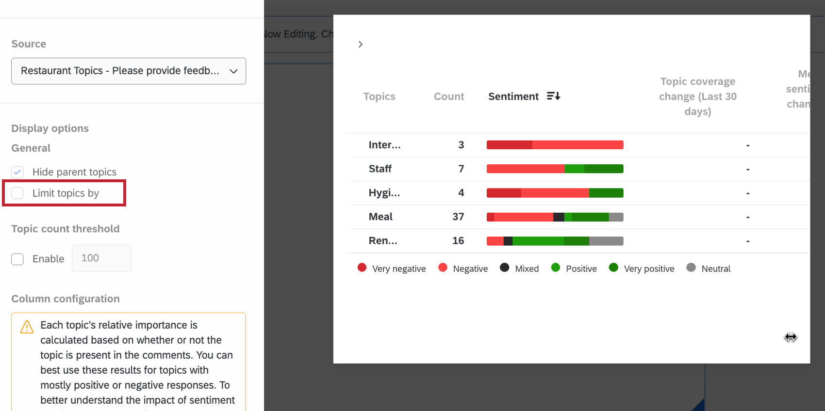 Qtip: If using the relative importance field, you must use 20 or fewer text topics. The widget will choose 20 topics automatically if there are more than 20 topics. To change the selected topics, click the Exclude button while editing the widget and then select the topics you would like to include. See the excluding topics section for more information.Attention: It’s not recommended to include the Relative Importance column if the total response count across all data sources exceeds 5 million. Analyses above this threshold may timeout or fail.Attention: After adding the relative importance column, it may take up to 1 hour for the calculation to complete. This column will recalculate if you collect new responses or make changes in Text iQ. When calculating, the relative importance column will show a loading message while the rest of the widget will load as normal. Note that newly collected responses will be on a small delay of up to 1 hour before they’re incorporated in the relative importance calculation.