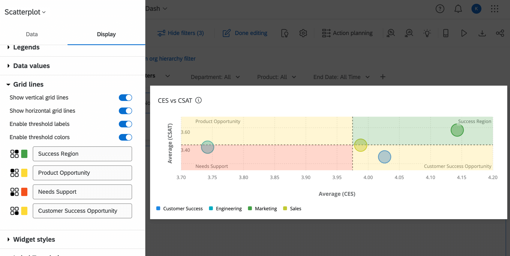 When the Enable threshold labels setting is turned on, labels will display in the four corners of the scatter plot. Each corner is identified as a “Quadrant” by default, but this can be edited by clicking on their field in the setting.