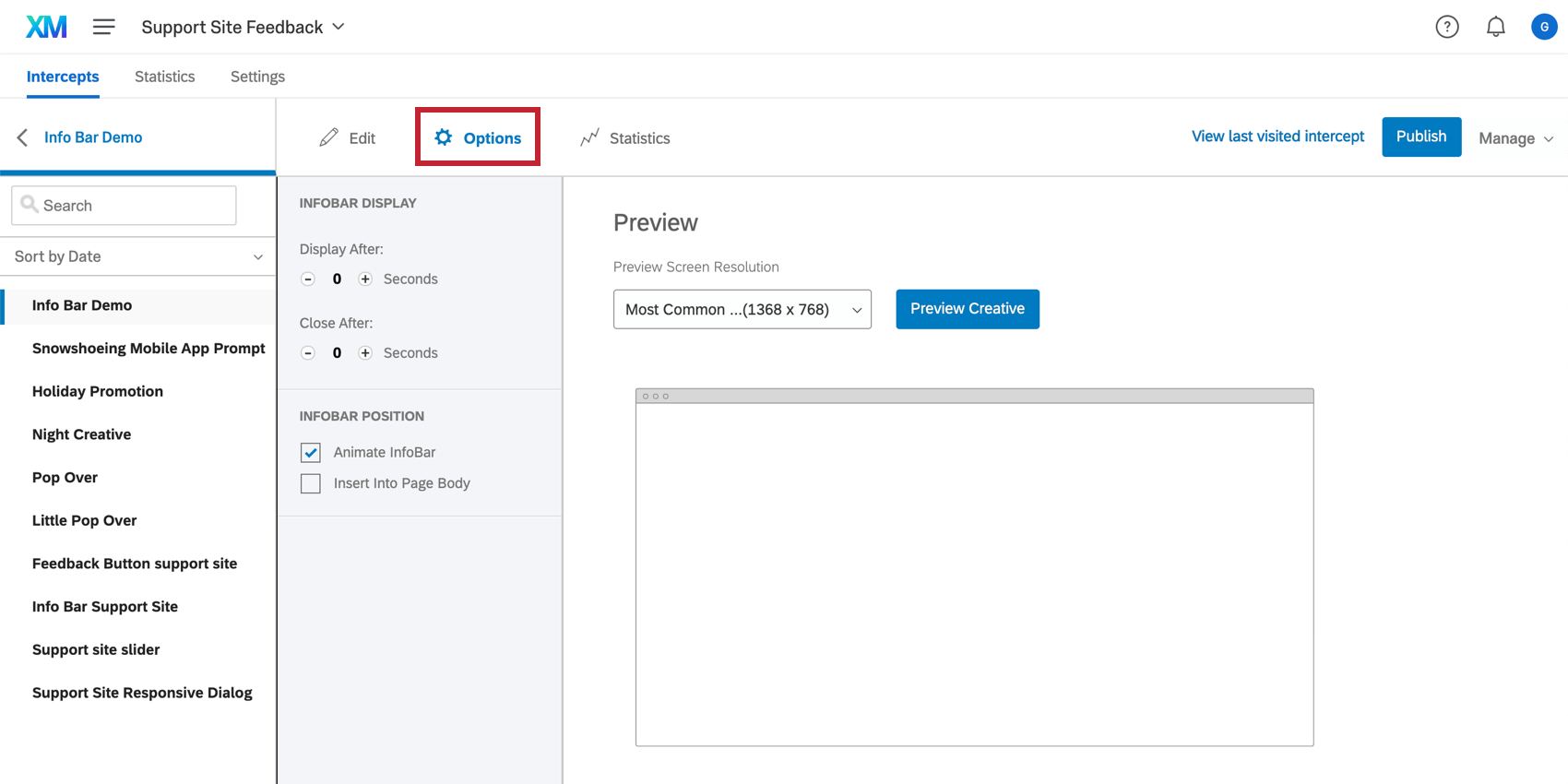 In the Options tab, you can preview your creative. Preview Creative mode is a quick and easy way to test whether your creative is formatted as you intend. The Preview window will take into account any conditions you have set in your creative options. If you do not see your creative appear in the preview window, you will want to go back and double check the formatting of your creative.