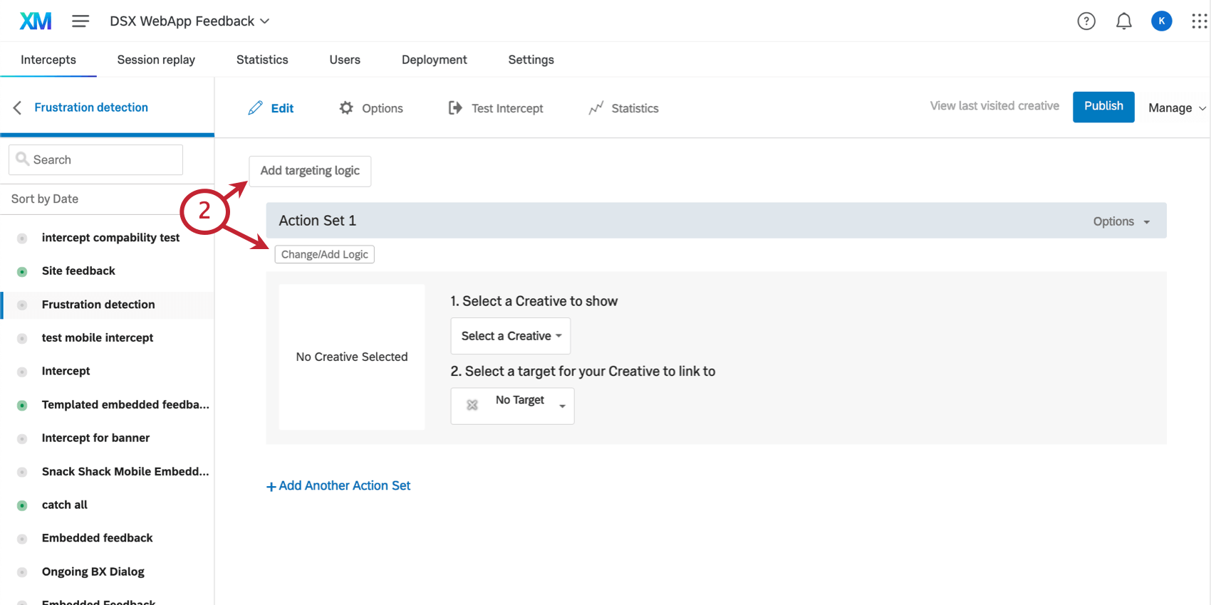 Qtip: Frustration targeting only works on pages where Digital Experience Analytics is active. In addition to this, a session that is not sampled cannot use frustration targeting logic. Learn more about sampling and page groups. - If you’re using an individual intercept, add logic to the entire target or to an individual action set.